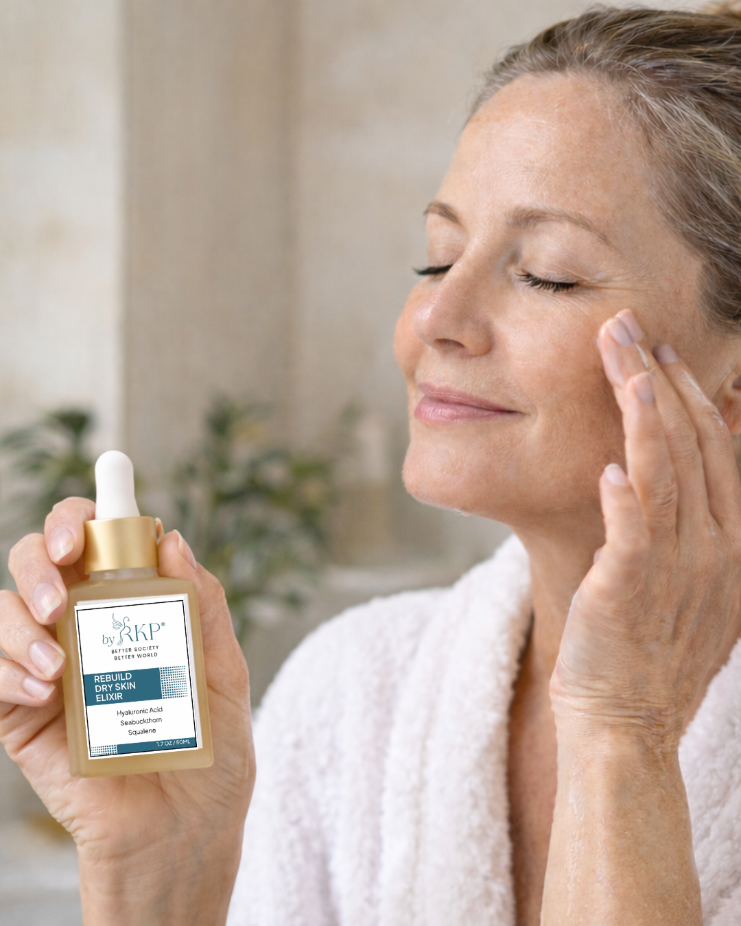Use the Rebuild Dry or Sensitive Skin Elixir as the core boost of hydration and barrier support. This keeps skin calm, resilient, and prepped for makeup/SPF.