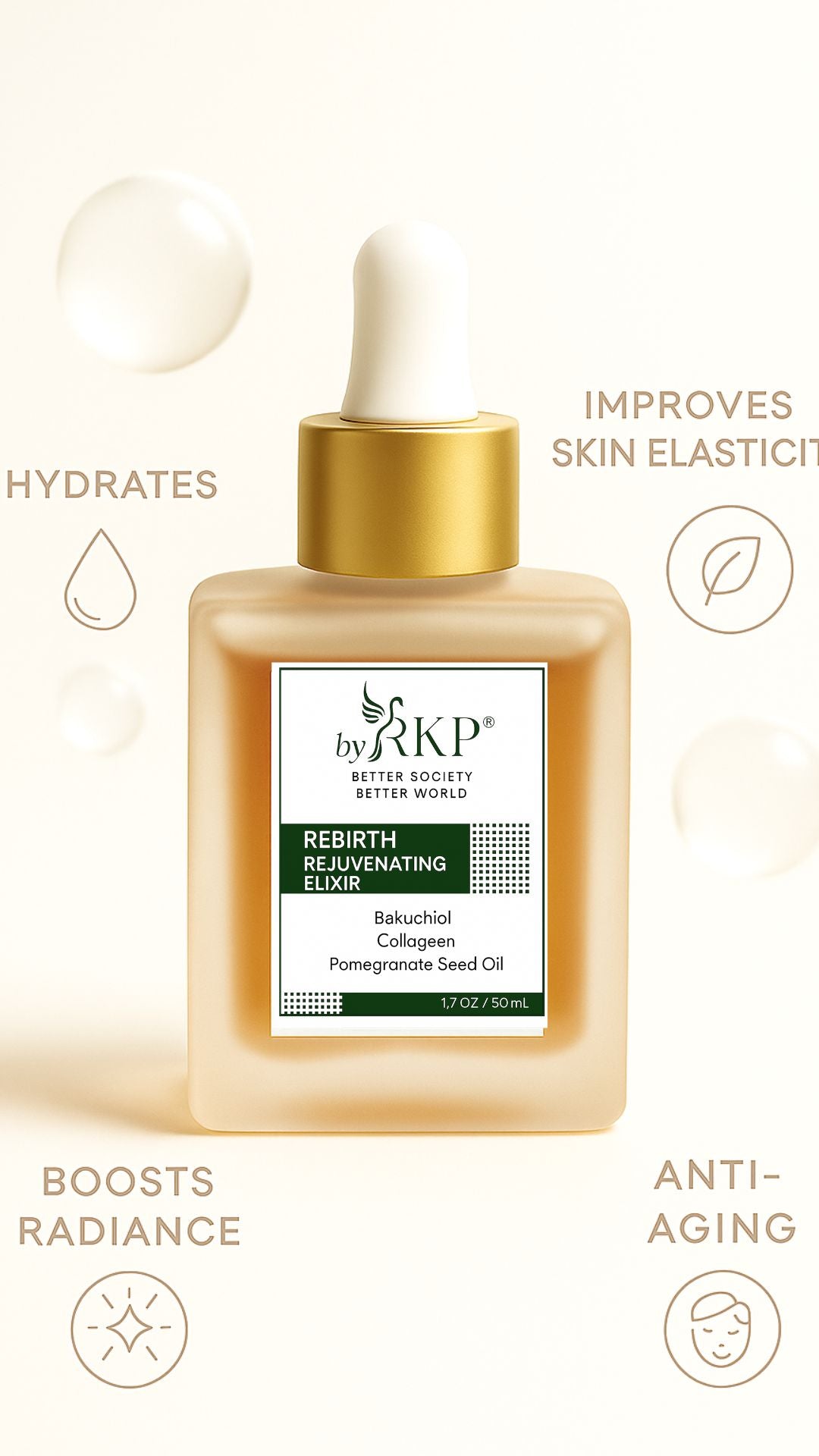 Collagen helps support firmness and elasticity, bakuchiol (a gentle botanical alternative to retinol) smooths texture and refines tone, while pomegranate seed oil floods the skin with antioxidant-rich hydration. Working in harmony with your body’s nightly repair cycle, Rebirth Rejuvenating Elixir replenishes moisture, encourages renewal, and leaves your skin soft, radiant, and visibly revitalized by morning.
